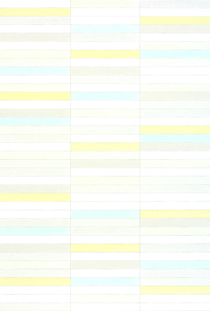 Trevor Sutton’s Shadow 6 (2014) uses oil on paper to create a transparent depth of field. We watch the interplay of shadows and feel the emotional impact that is situated in the space beyond the pencil grid. Further, we sense the memories that come crowding into the image. This is because the blurred colour choice echoes the rhythm of modern life. That rhythm is picked up in the painting on a panel within the more compressed framework of the larger work. In Unforeseen (2014) the colours are pared back to very light Naples yellow, azo yellow and cobalt turquoise. These are compelling combinations, perhaps reading as interactions and patterns of behaviour, or as sounds on the edge of hearing.