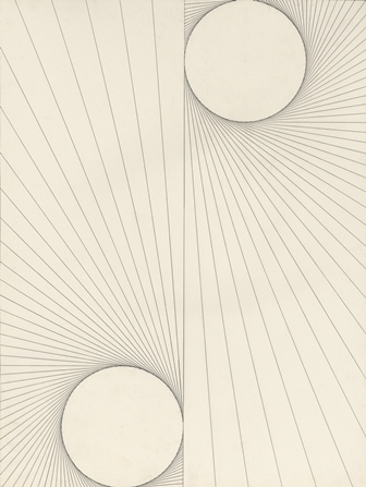 The book contains a series of analytical drawings from the 1980s in which elegant gestalts emerge from systems of radiating, converging and intersecting lines – some straight, some arcing – which form grids, horizons and singularities. In other works, the same lines are used to dissect the rectangle of paper, and the component pieces rearranged to form new gestalts.