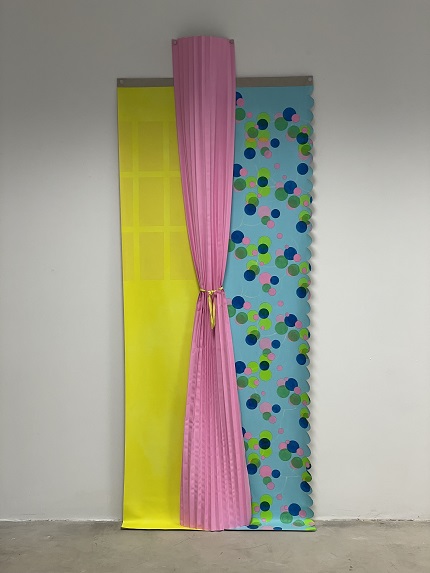pleated curtain of pink canvas that is drawn together in the middle with a yellow