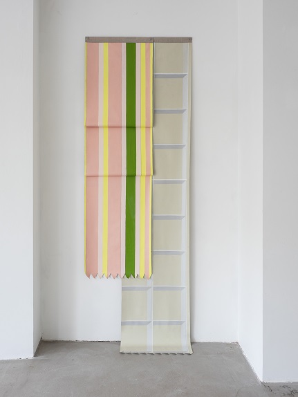 into the canvas.  Pinned to the wall, the piece hangs loosely onto a low-level varnished