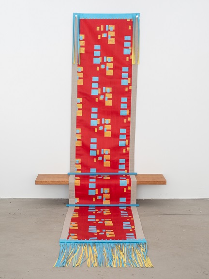 red fabric patterned with small, ice blue and chrome yellow rectangles and bordered