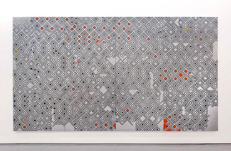 UNTITLED 2015 Spray paint, ink, aluminium tape, paper and varnish on wood 204 x 370 cm