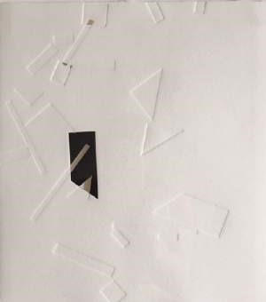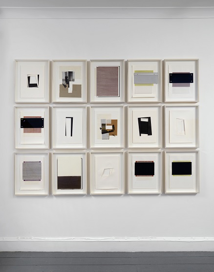 EB: Yes, some of them are blind embossed and these things started off when I was making, am still making, large scale installations of painted aluminium sections. To work out the ‘composition’ for these I take a series of shards or offcuts of aluminium and throw them onto an etching press. Then they get run through the press with a piece of paper over the top so you get a heavy emboss of these geometric shapes. I then repeat that process two or three times and where the embossed shapes intersect I cut them out. Sometimes, one or a number of plates are inked up and so it’s partly a monoprinting process and partly an embossing process. But they started off as diagrams for where I should place the painted aluminium sections in the installations and then evolved into something else. They’ve become an intrinsic part of other processes, other paper works. So a lot of the other paper works have an element of embossing in them. I remember when I started printmaking, when I was 16 or 17, that first moment when you pull the damp paper off the plate and see what you’ve got, it was less about what was printed on the plate but just the brute fact that there was this object, the presence of which is implicit in the trace of what is left.