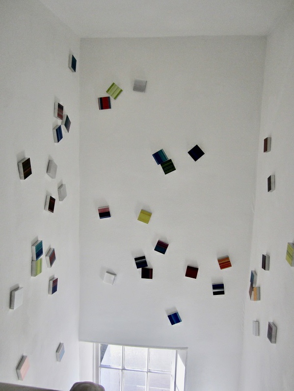 KL: I’d like to ask you a bit more about the installations. The piece in the show that is hung as you go up and around the staircase leads the viewer up and around and forces you to look up and down and from side to side and I wondered how you see that engagement with encouraging the viewer to respond to the work in a physical way?