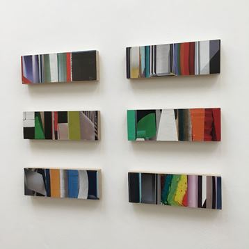 Laurence Noga, 6 works including So Orange Filtered Violet, 2016, acrylic collage on panel, 15 × 30 cm.