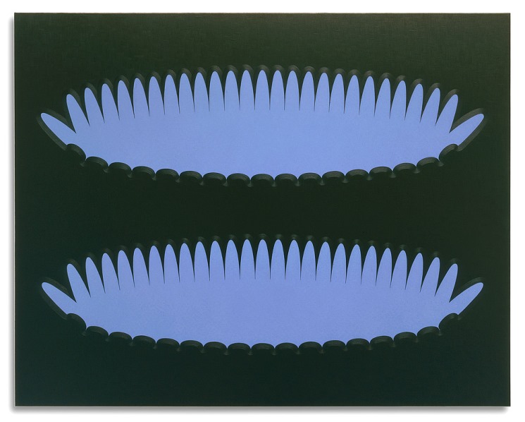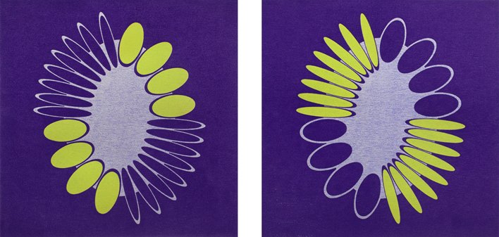 I'd like to start by asking you about the geometric structures you devise which underpin the actual painting. These are incredibly elegant elliptical forms, often repeated or mirrored with subtle alterations. Could you talk a bit about your process in terms of how you arrive at these forms? I'm particularly interested in the nature of the edges and the illusionistic effects of perspective.