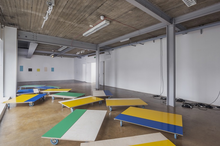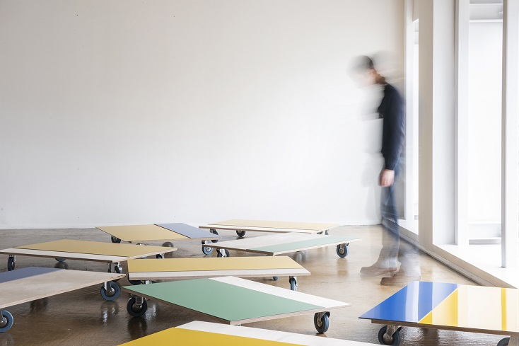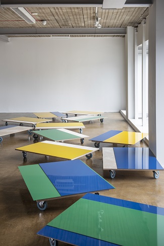 green/yellow/blue), 2018 (aluminium composite, birch ply and castors), waits - three