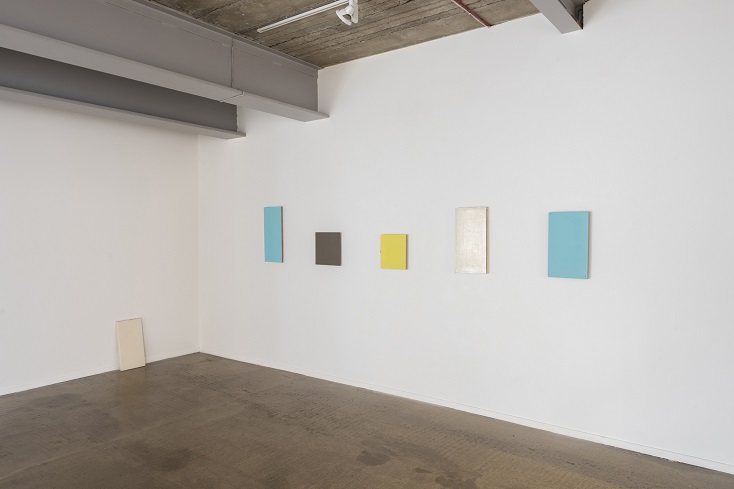down the right hand edge of the work’s yellow section. Across the gallery, a flatbed