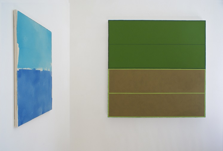 Left: Peter Joseph, Turquoise and Cobalt Blue, April 2016, acrylic on canvas, 47 x 38 cm